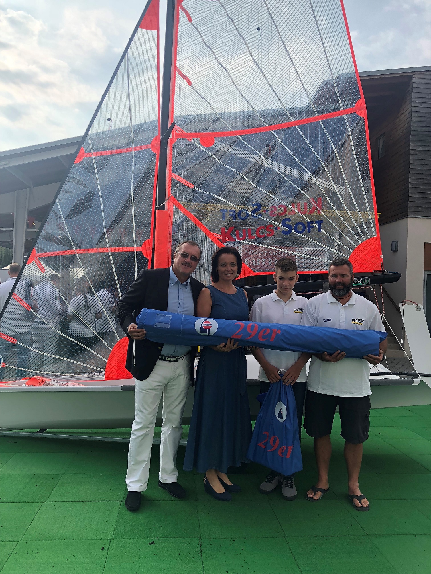 Igazgatósági tagjaink: Tuburz Erika és Kulcsár Tibor személyesen is képviselték a Kulcs-Softot a megnyitón, ahol ünnepélyes keretek között, átadták a 6 db új vitorlát, amelyet a Kulcs-Soft vásárolt eme szép sport új generációjának: A 12 gyermekbol álló 29er flottának.