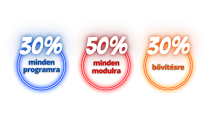 Limitált ideig egyedülálló kedvezményekkel készültünk ügyfeleink számára. Ragadja meg a lehetoséget, hogy programját még nagyobb tudással és még több funkcióval a kezében használhassa – vagy akár egy új szoftverrel erosíthesse meg vállalkozását.