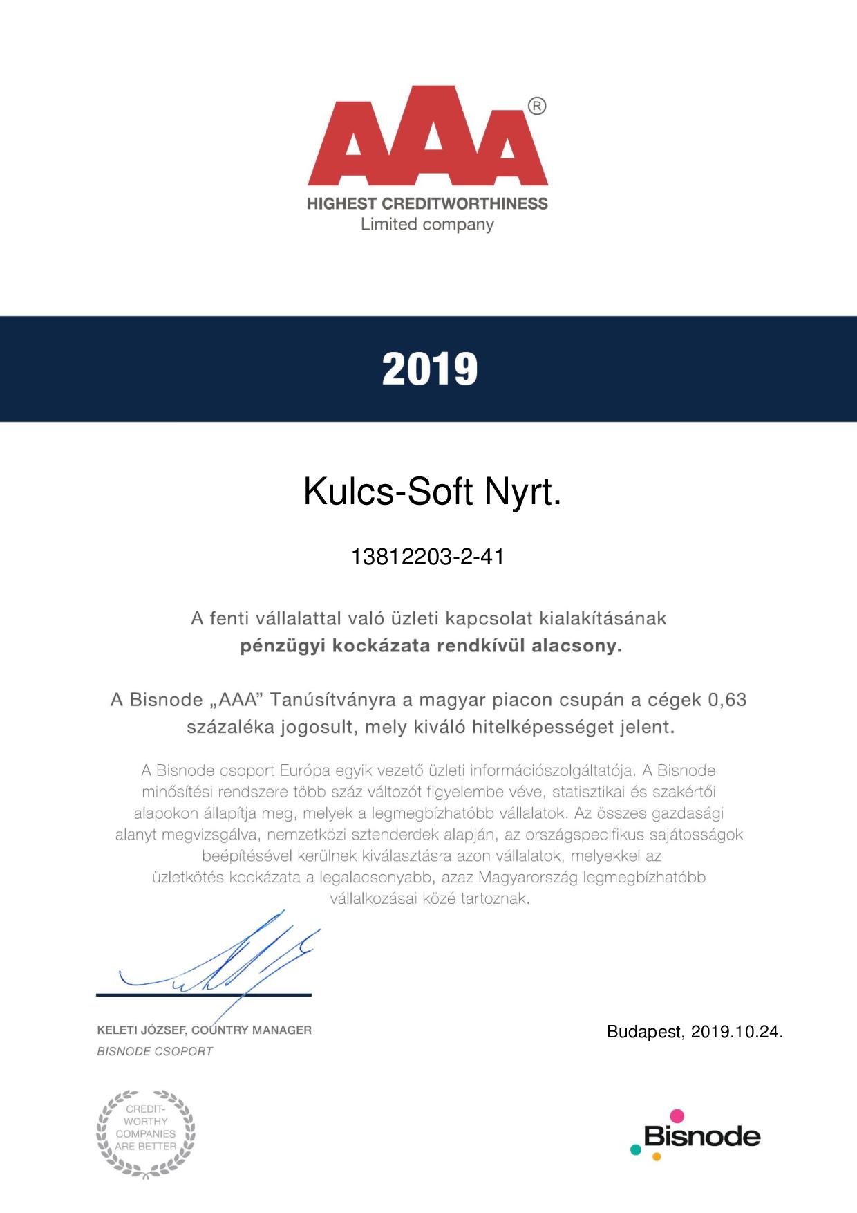 A Kulcs-Soft Számítástechnika Nyrt. a Bisnode AAA (tripla A) tanúsítványát kapta meg, mellyel Magyarországon csupán a cégek 0,63 %-a rendelkezik, és azt jelzi, hogy velünk az üzleti kapcsolat kialakításának pénzügyi kockázata rendkívül alacsony.