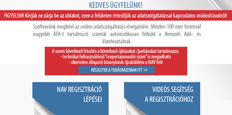 A Kulcs-Ügyvitel termékcsaládunk számlázó termékeibe bekerült kezdooldali figyelmezteto ablakot kérjük ne zárja be, ezen a felületen folyamatosan tájékoztatjuk arról, milyen módosulások történtek a NAV bekötéssel kapcsolatban!